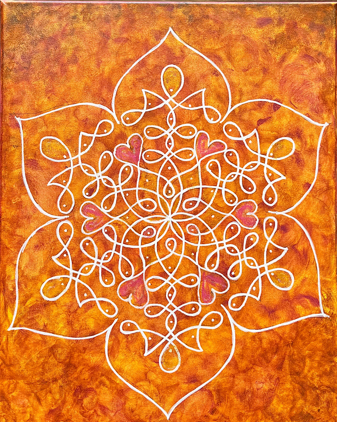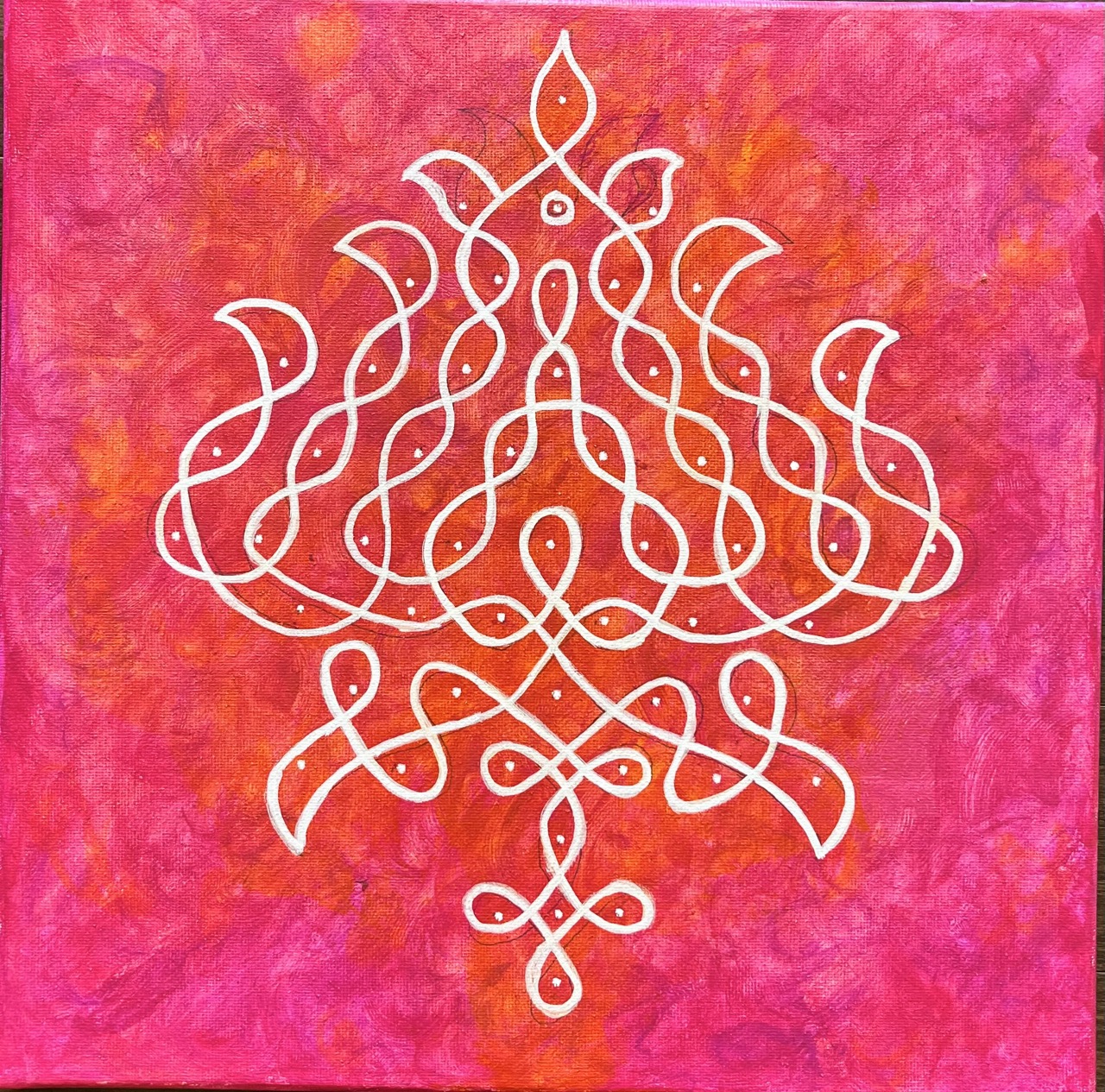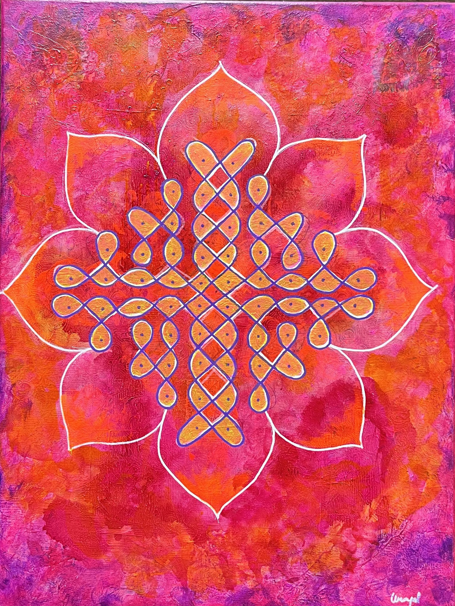 My work lives at the intersection of human fragility and the harmony that emerges when we learn to feel deeply. Through expressive portraiture, sacred geometry, and symbolic abstraction, I explore identity, belonging, and the emotional patterns shaped by our lived experiences. Rooted in Tamil indigenous traditions—particularly kolam—I use dots, lines, and repetition as a visual language to examine how structure and flow coexist within both the inner and outer worlds.