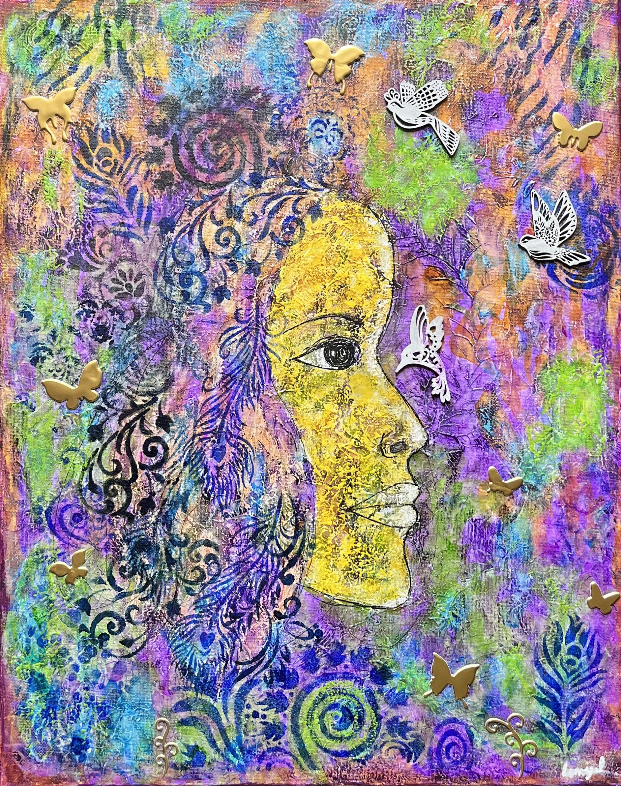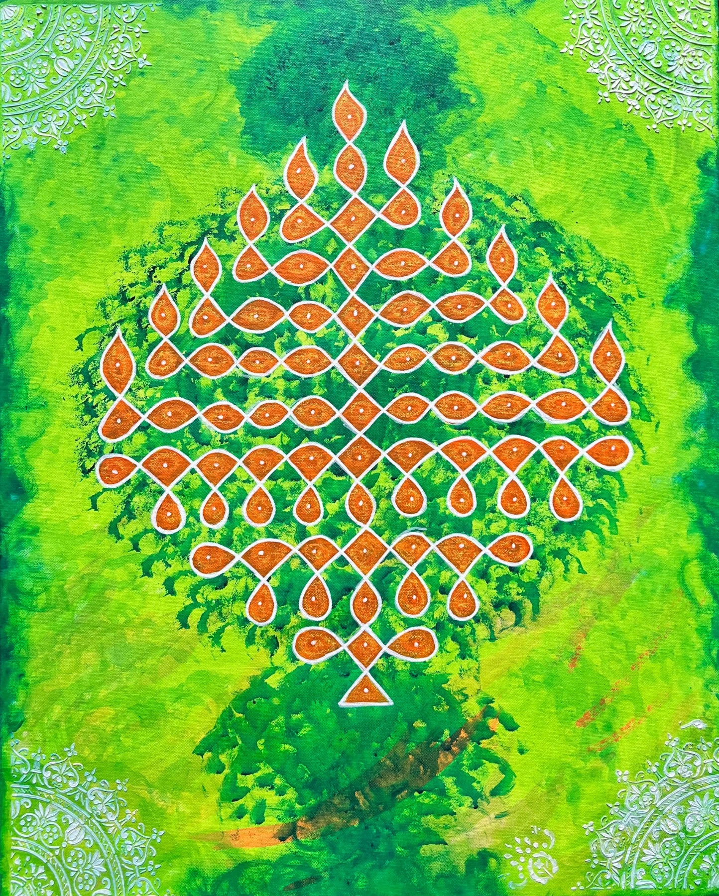 My portrait work, Embody Every Version of You, explores archetypes that live within us all—the Maiden, Warrior, Empress, and Sovereign—each holding both shadow and light. These figures reflect the fluidity of identity and the reclamation of voice through self-recognition. Alongside this, kolam-based works and symbolic nature imagery—tree-women, birds, florals, lunar forms—extend this inquiry into the collective, positioning geometry as a living system that connects body, land, ritual, and community.