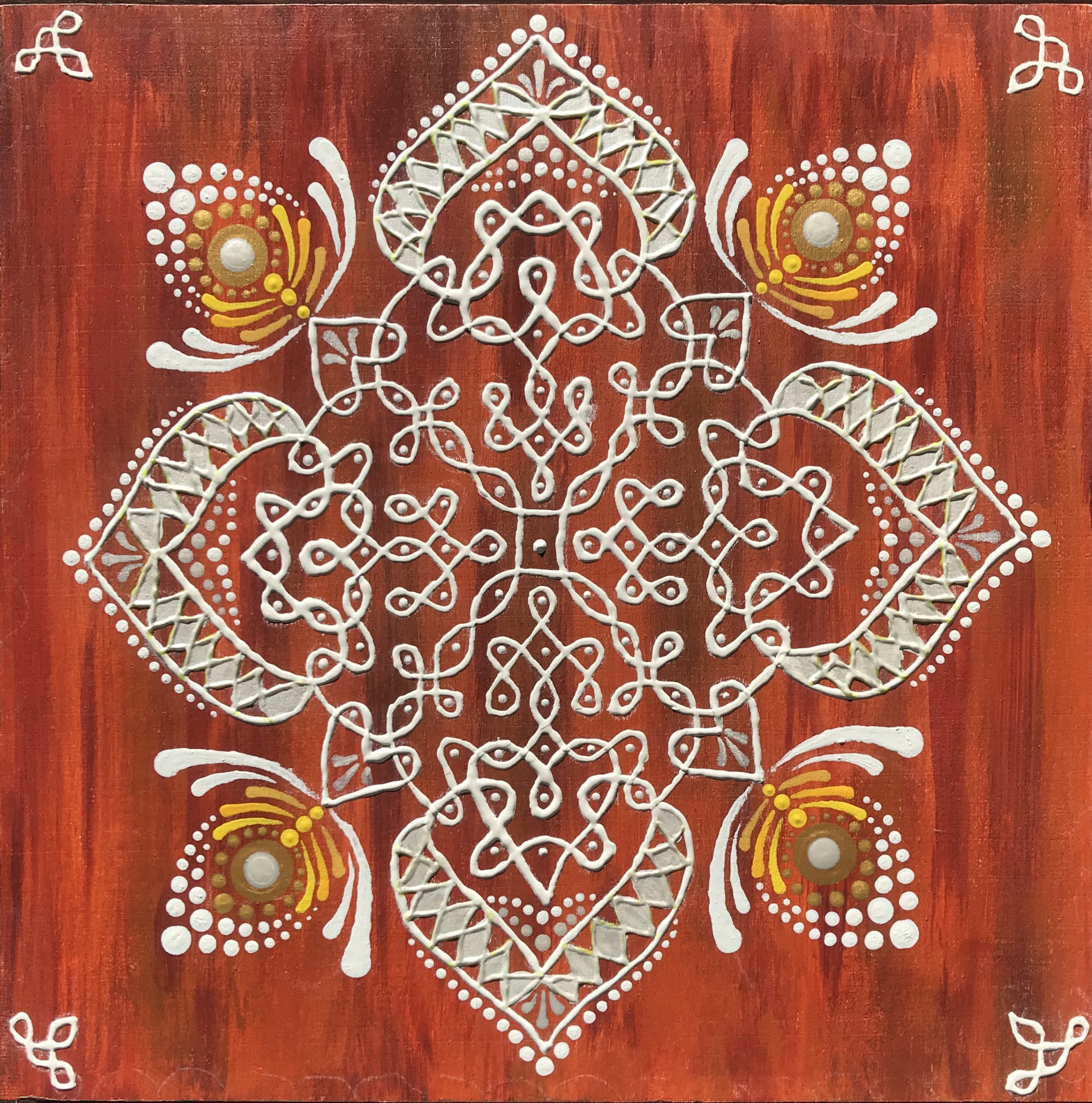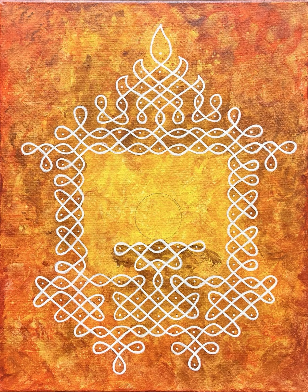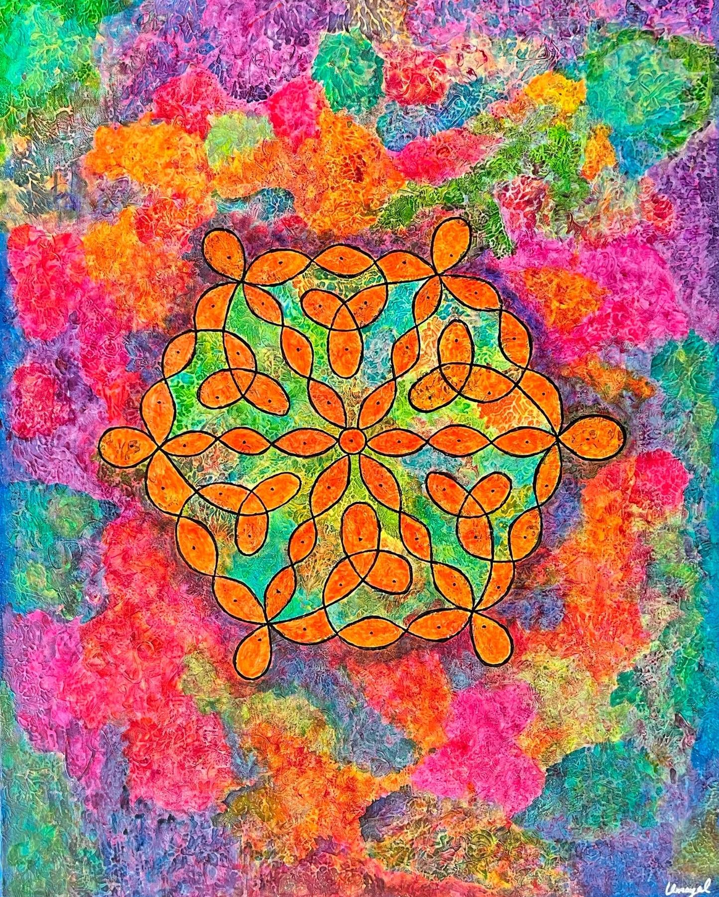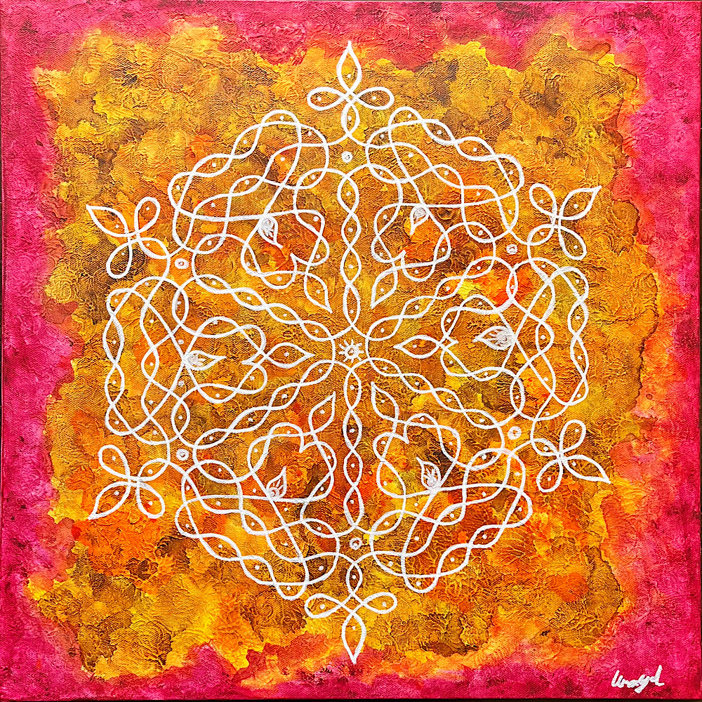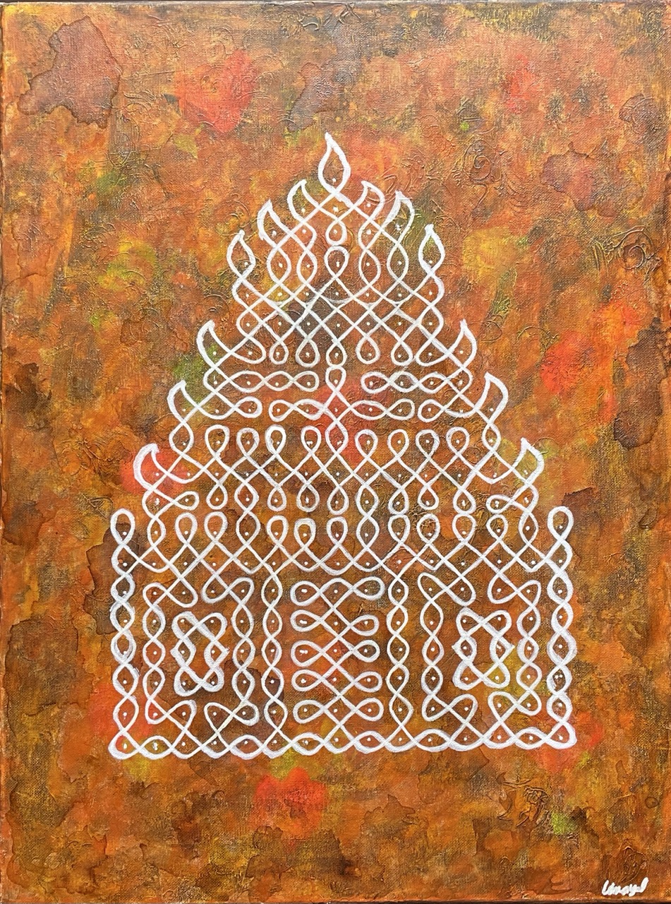 Through kolam—an ancient Tamil form of sacred geometry—my work explores geometry as an energetic system rather than a purely visual one. Kolam functions as a map of balance, where structure and flow exist in continuous relationship. One does not exist without the other; coherence emerges through their synergy.